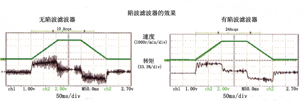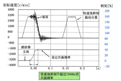 高性能的機械適應性 ◆無論是易振動的傳送帶驅動機械,還是高剛性的絲桿傳動機械,都可用自動調整功能實現高速定位。 3.超低振動 自適應濾波器 ◆內置自適應濾波器,可以根據機械共振頻率不同地調整陷波濾波器頻率。 ◆可以控制由于機械不穩定以及共振頻率變化而發生的噪音。 兩個陷波濾波器 ◆內置不用于自適應濾波器的兩個獨立通道的濾波器。 ◆兩個陷濾波器可以以1Hz為單位,分別設置陷波的頻率和幅度。
