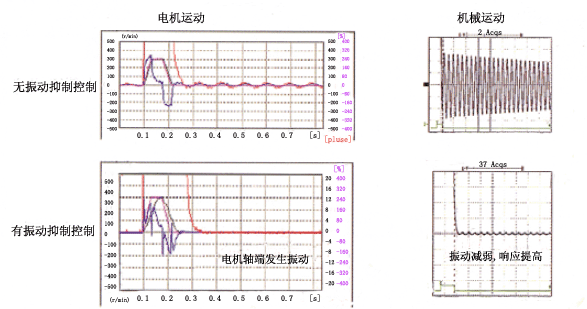 2.高速高響應 速度響應頻率最高可達1kHz ◆內置瞬時速度觀測器,可快速、高分辨地檢測出電機轉速。 高性能的機械適應性 ◆無論是易振動的傳送帶驅動機械,還是高剛性的絲桿傳動機械,都可用自動調整功能實現高速定位。